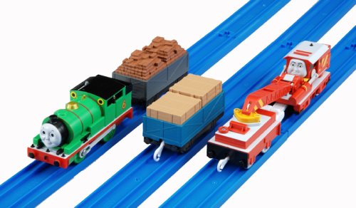 面白い動き いつも楽しくあそんでます。パーシーが付いています。貨車にギミックがついていて、青い貨車は、荷物が上下して、灰色の貨車は、走りながらぐらぐらゆれます。 10シリーズ目の新キャラクターロッキーがついています。足場がでたり、クレーンもうごきます。ただし、イギリスのロッキーと違って先端部分が上下しないのが、とても残念です。 でも、他の貨車の動きが面白いので、個人としては、星5つです。